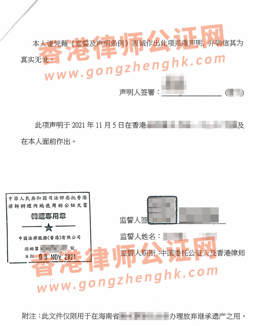 香港人辦理放棄繼承遺產(chǎn)聲明書公證樣本